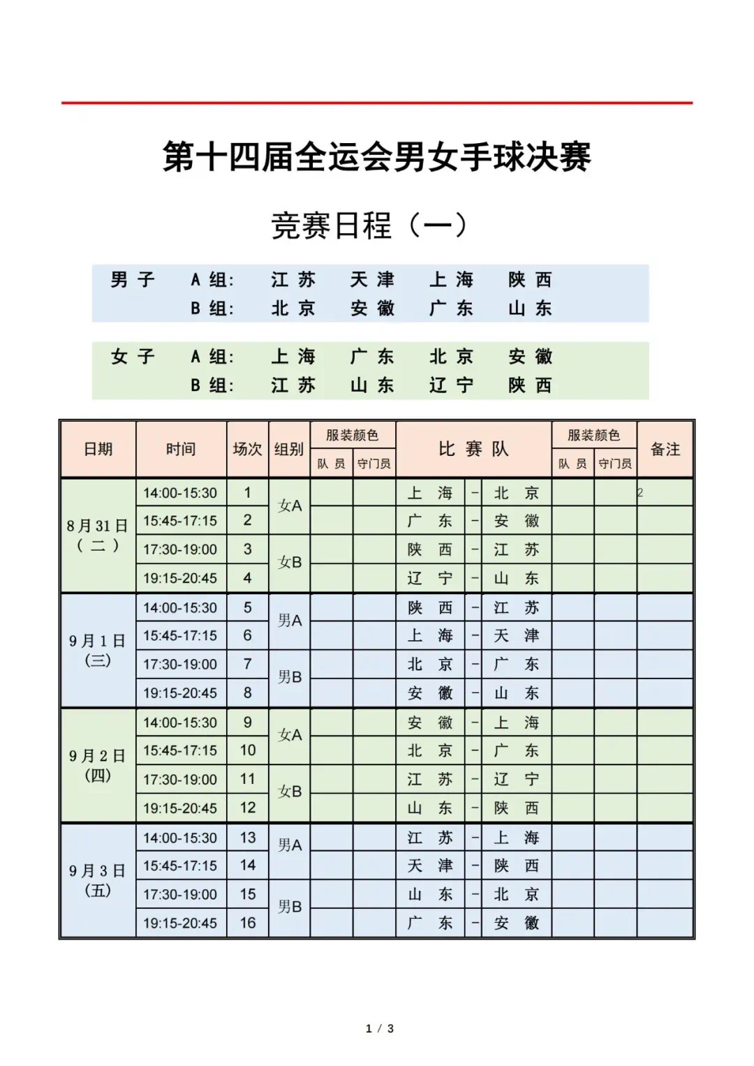 男女手球决赛竞赛日程