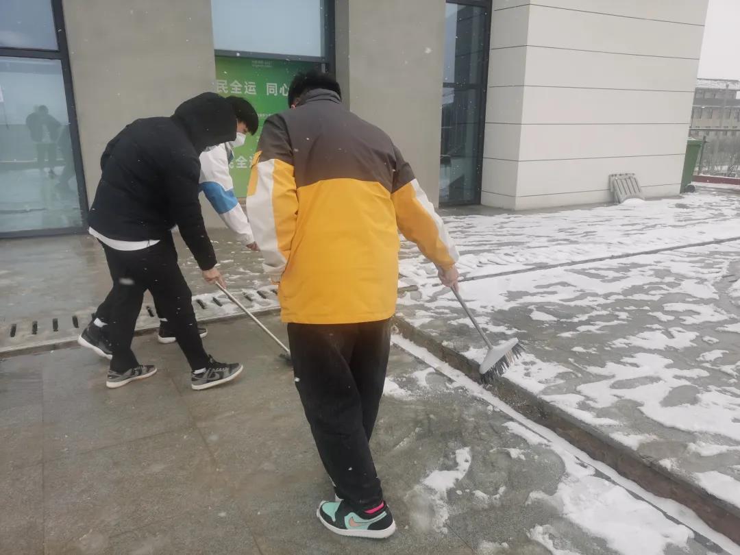 运动休闲学院成立了防疫志愿者队伍,组织同学到食堂等各公共场所清理积雪,为校区师生提供了安全干净的生活场所。