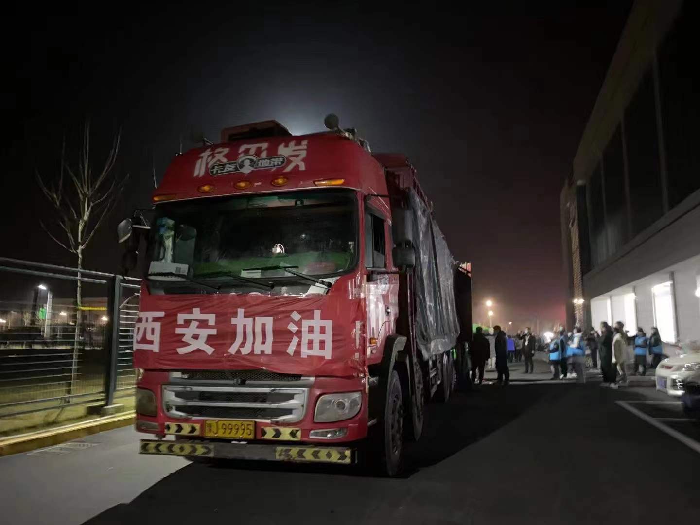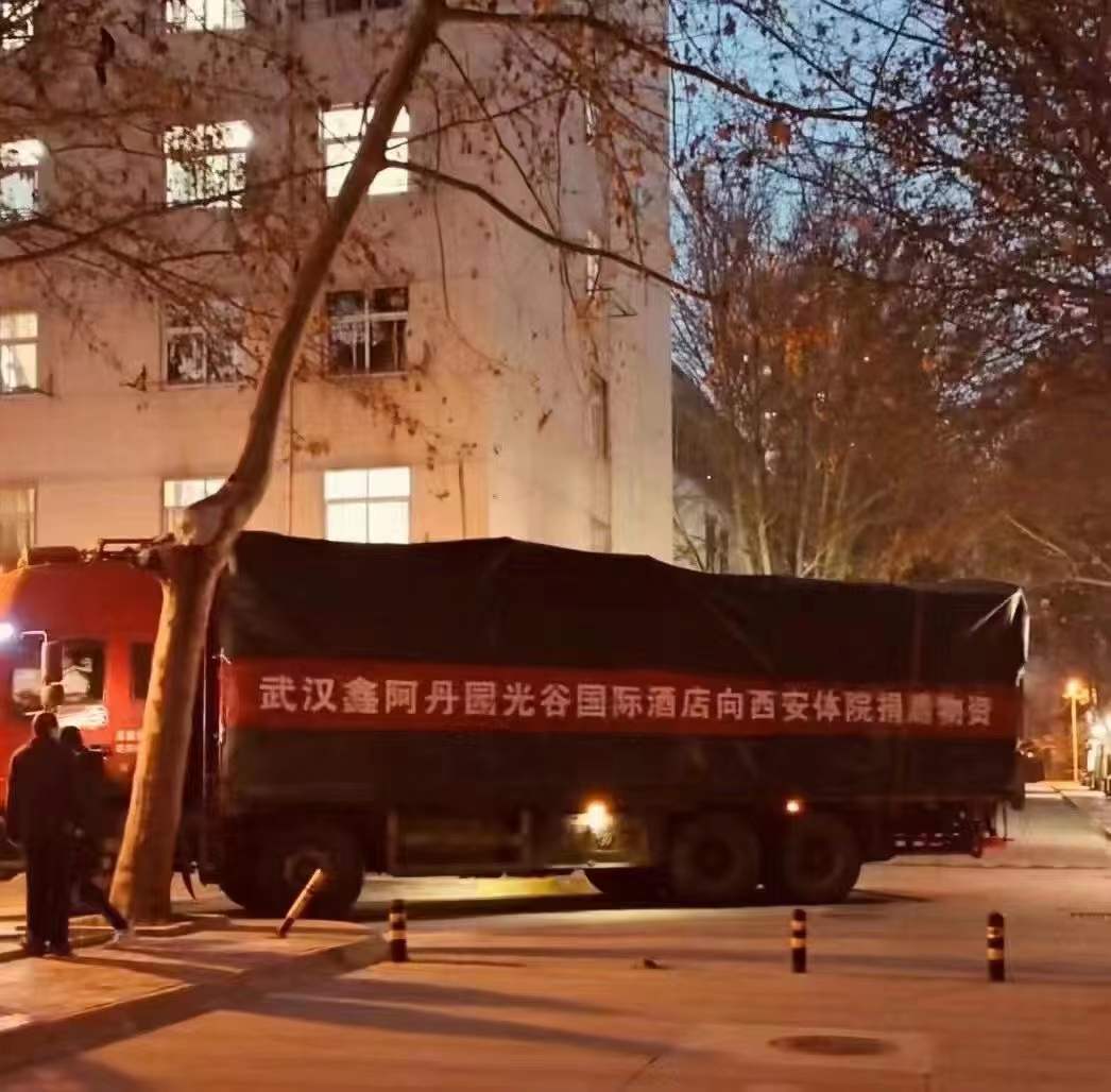 一方有难,八方支援。武汉鑫阿丹光谷国际酒店所派货车在傍晚抵达西安体育学院鄠邑校区,向校区捐赠了丰富的物资。