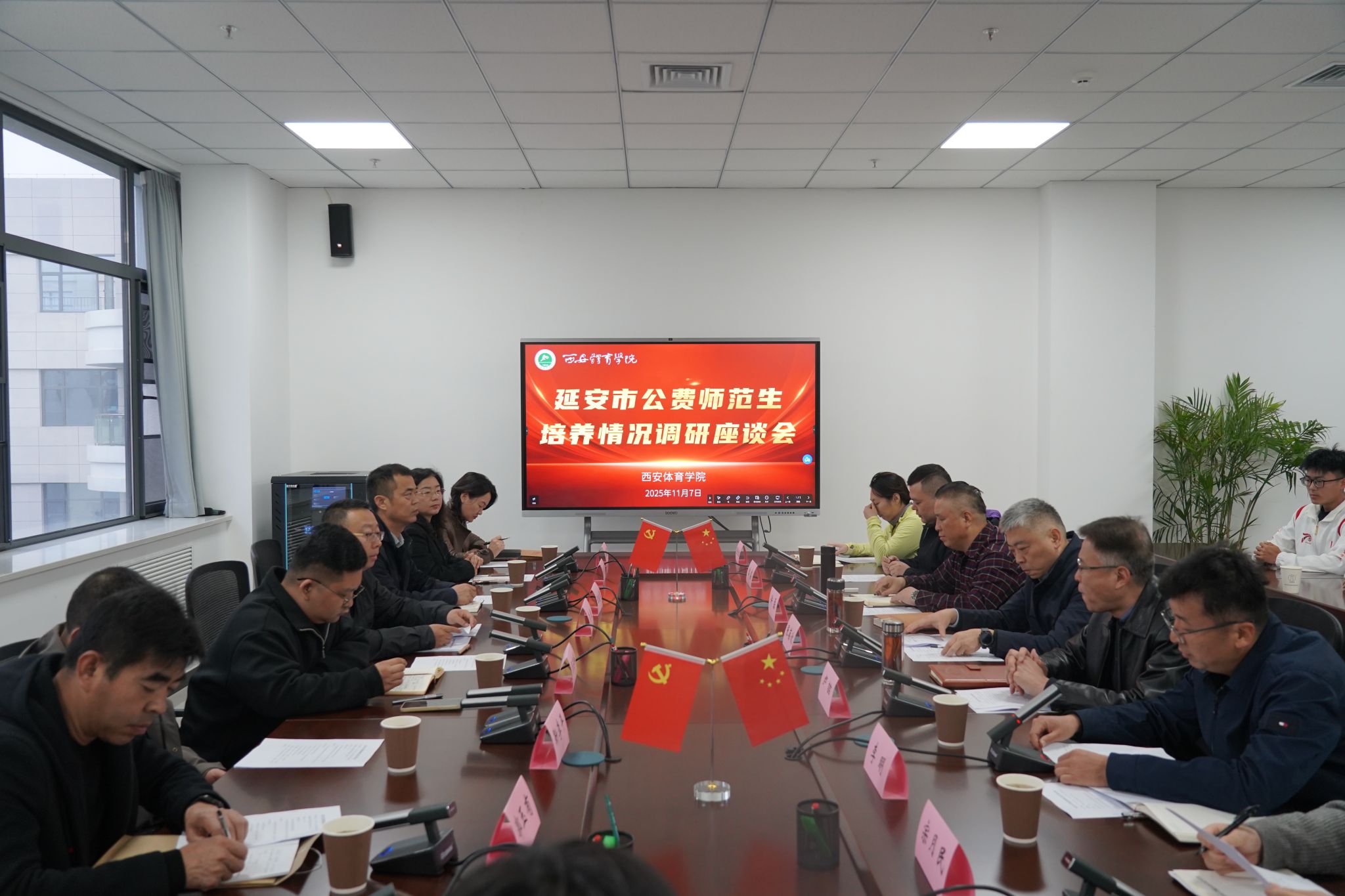 座谈会上,副校长张葆欣向延安市教育局考察团一行表示欢迎,并详细介绍了自2024年与延安市政府启动公费师范生培养项目以来取得的成果:2024年首批招录的10名公费师范生已顺利入学并开展系统培养;2025年招生规模进一步扩大至27人。他表示,延安市政府将未来体育师资培育的任务托付我校,这既是对我校办学实力的高度认可,更是双方携手推动延安体育教育事业的重要契机。项目每一步的扎实推进,都离不开延安市政府在政策支持、资源保障等方面的大力协助与紧密协作,学校对此深表感谢。