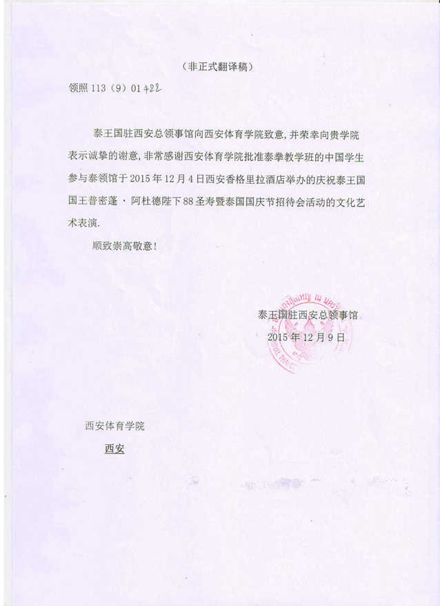 2015年12月4日,泰国驻西安领事馆于举办了庆祝泰国国王生日暨泰国国庆日活动,我院学生应邀参加了泰拳艺术表演活动,此次活动圆满成功,泰王国驻西安领事馆专门发来感谢信,以表达对我院学生艺术表演的感谢。