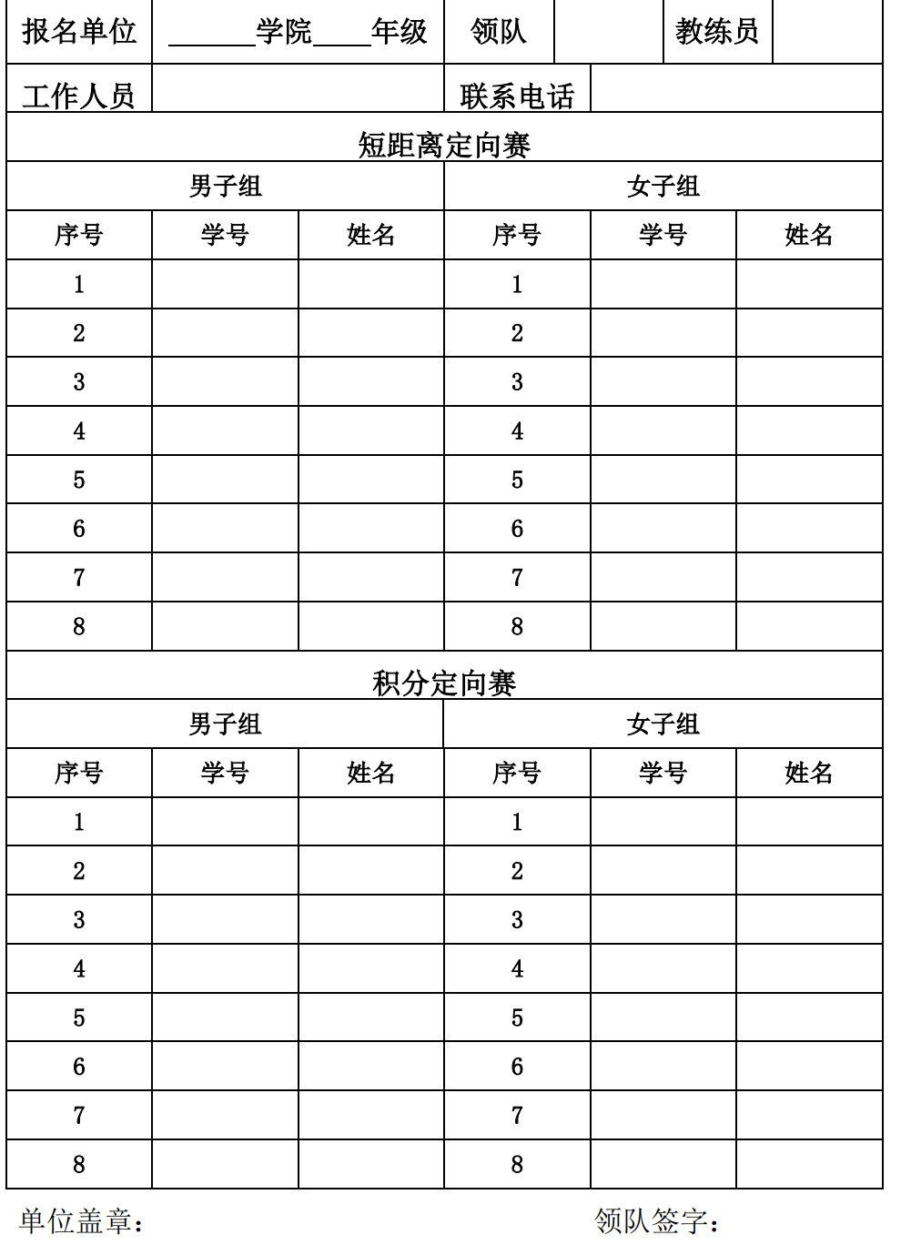 (一)短距离定向赛:每单位男女可各报 8 人。 (二)积分定向赛:每单位男女可各报 8 人。 (三)短距离赛与积分定向赛不得兼项。