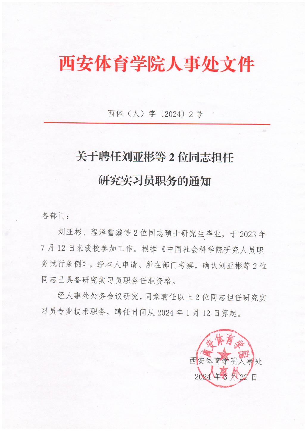 关于聘任刘亚彬等2位同志担任研究实习员职务的通知