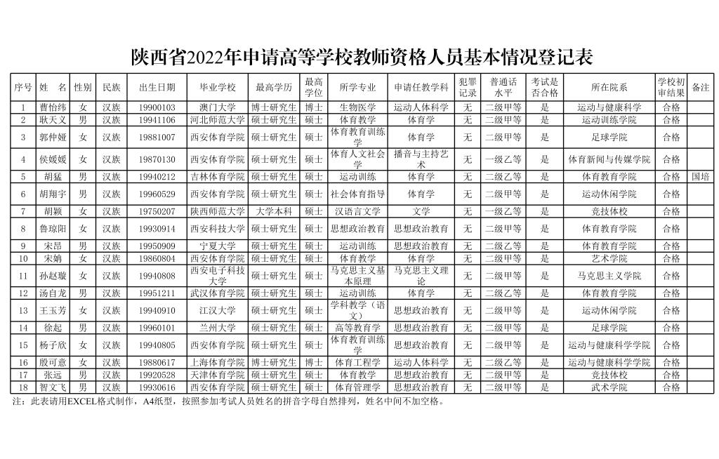 2022年申请高等学校教师资格人员名单: