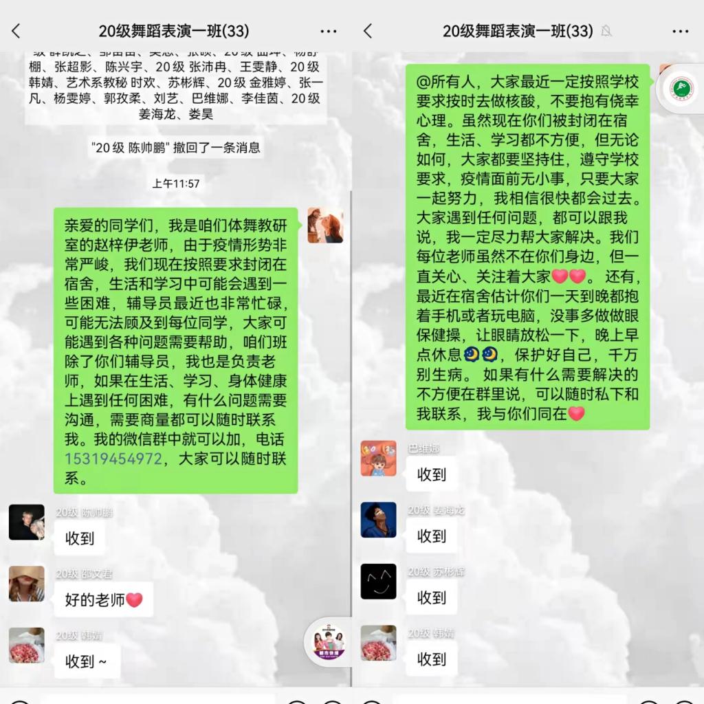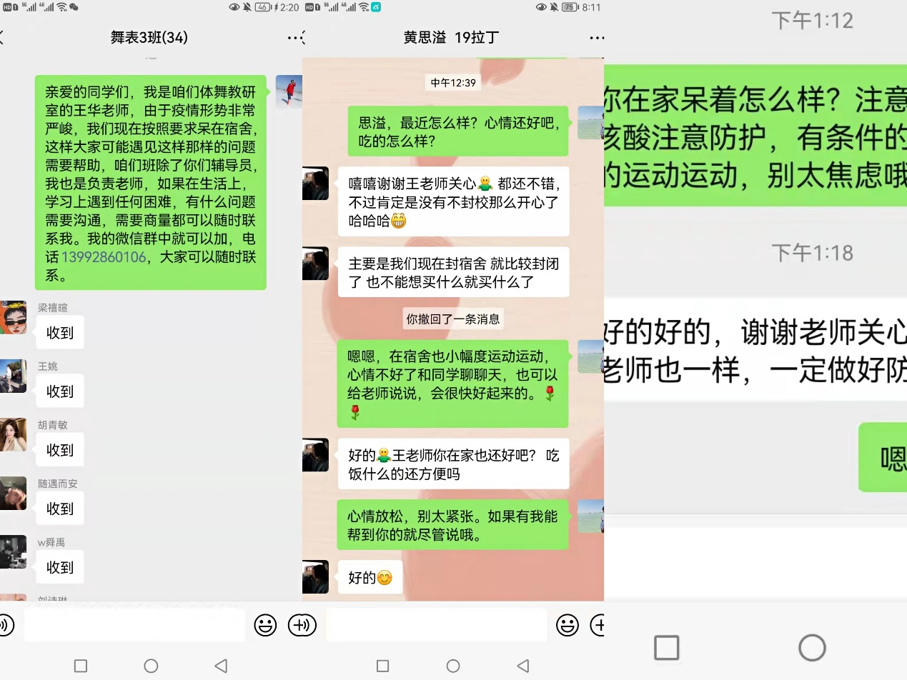 西安的疫情牵动着我们每个人的心,同时也被封闭在家,尤其是在学校的学生们,他们的活动空间小,环境不比在家里,难免在心态和心情都有影响。我们每个老师负责一个班学生,对学生们进行心理疏导与关心,通过微信群、腾讯会议等平台对学生进行了互动,尽可能了解学生目前的生活及学习情况,给予力所能及的帮助,对有特殊需求、急需解决的做以统计,立即上报学院。同时也会叮嘱学生做好隔离期间的个人防护,遵守学校要求,每天按时完成核酸检测,并将结果发到群里,勉励学生封闭期间调整心态,认真学习,完成本学期各科课程。停课不停学,隔离不隔心。我们的一句关心和问候会给学生很大的鼓励。这次的线上交流不仅是为了防护疫情。更是一次拉进师生之间的关系的特殊纽带。有人负重前行,有人为民而战,我相信,我们很快就能战胜病毒。西体,加油!