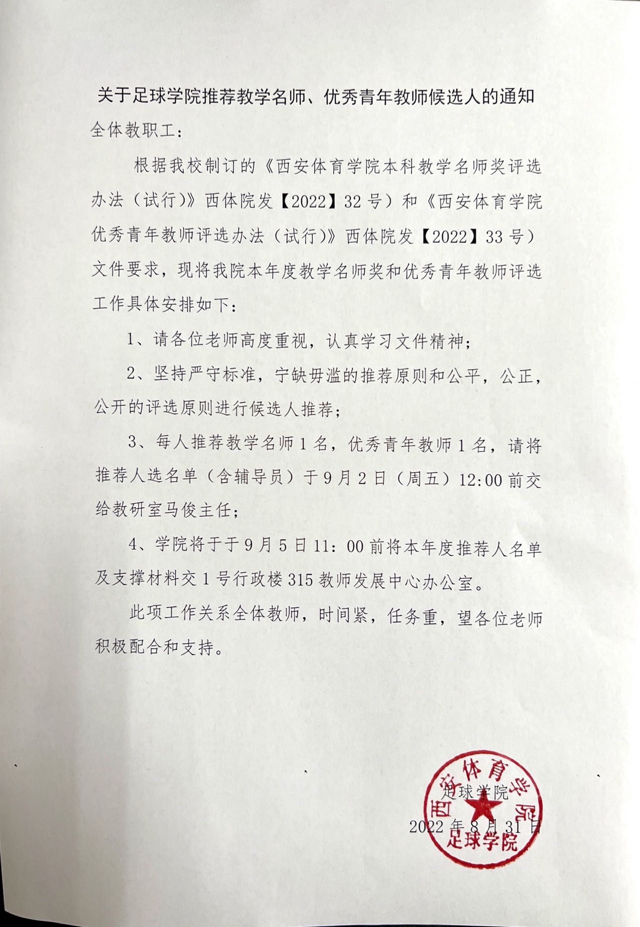 关于足球学院推荐教学名师、优秀青年教师候选人的通知