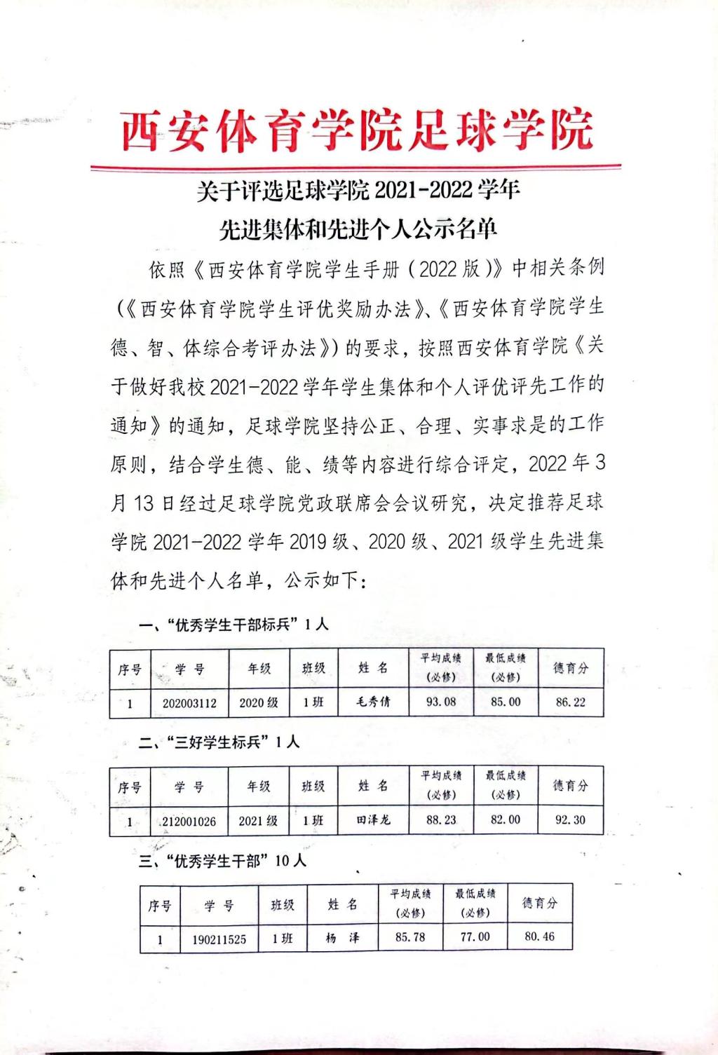 足球学院2021-2022学年先进集体和先进个人公示名单