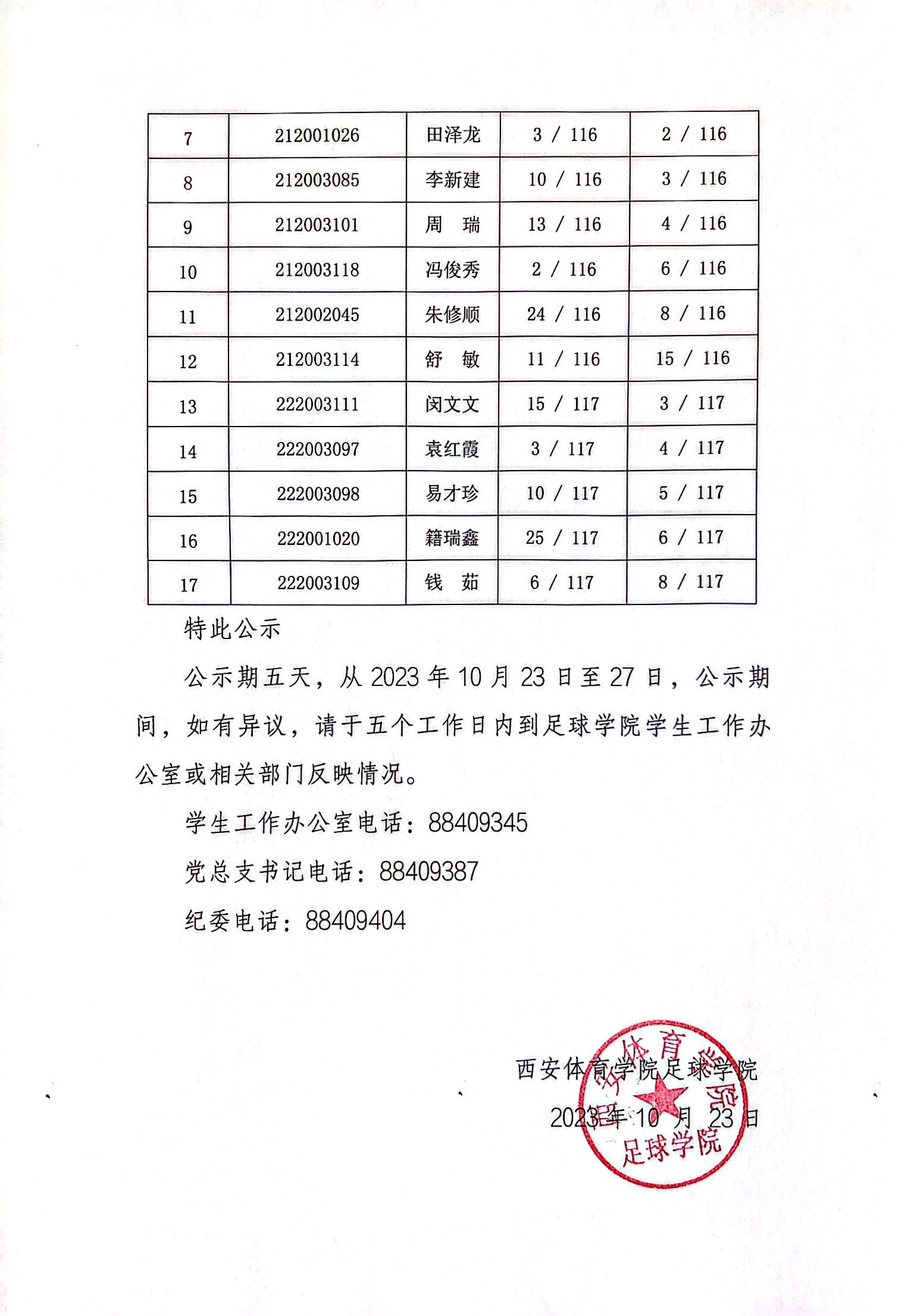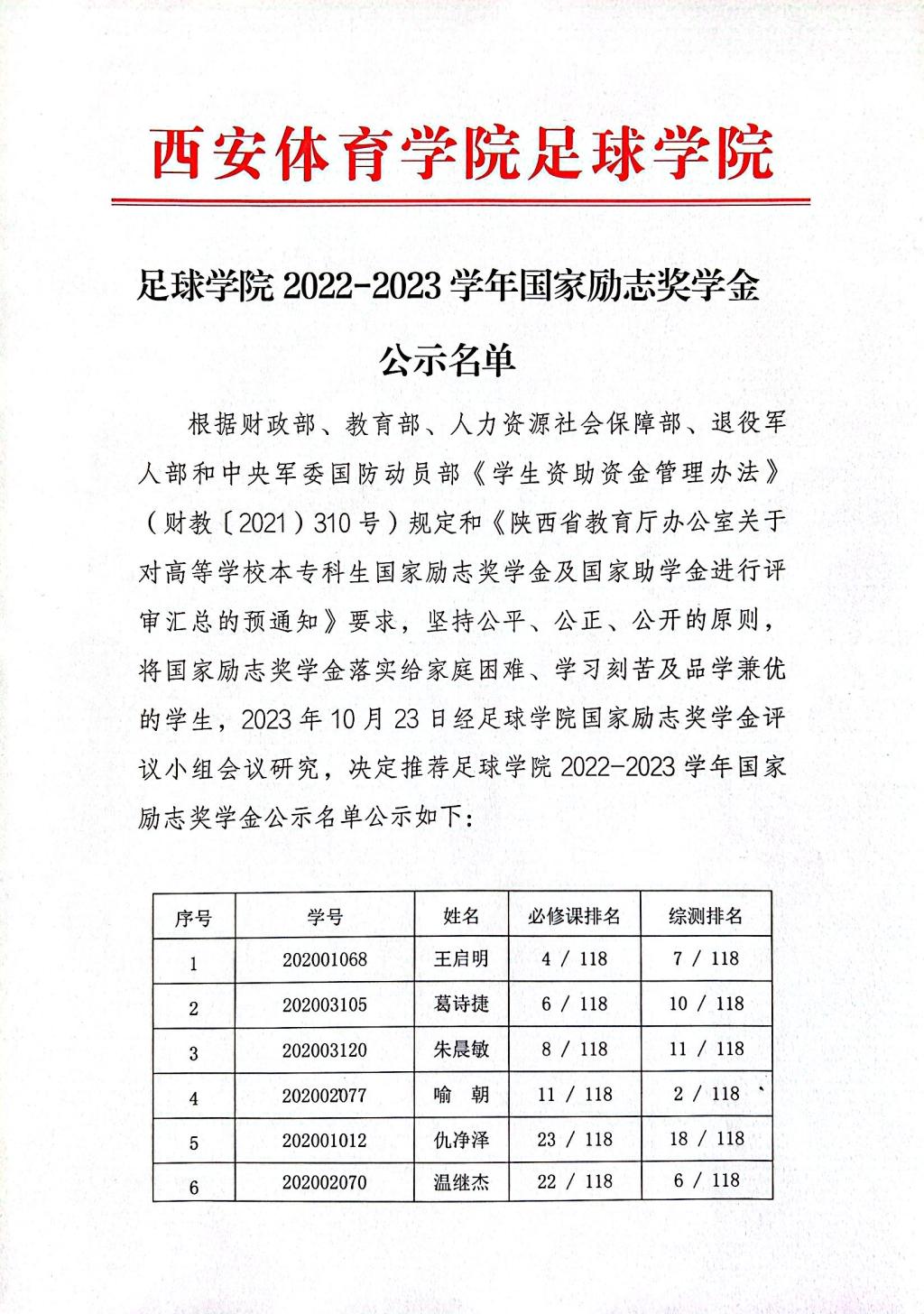 足球学院2022-2023学年国家励志奖学金公示名单